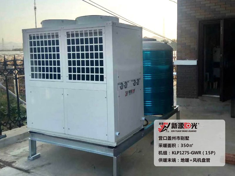 供暖面积:350㎡         机组:新源阳光15P空气能热泵机组         采暖末端:地暖+风盘