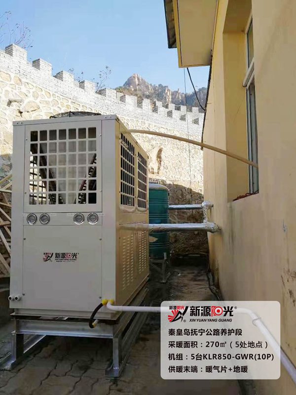 供暖面积:270㎡(五处地点,每处270㎡)         机组:新源阳光10P空气能热泵机组         采暖末端:地暖+新型暖气片